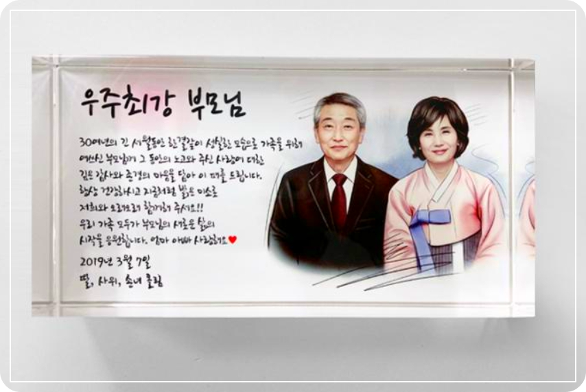한결같은 사랑으로 저희들을 키워주시고 든든한 버팀목이 되어주신 부모님. 존재만을도 큰힘이 되어주시는 부모님의 70년 인생을 기념하며 축하드립니다. 저희가 받은 많은 사랑의 감사함을 어떤 말로도 다 표현할 수 없지만 부족하나마 이 감사패에 모든 정성을 가득 담아드립니다. 그 큰 사랑에 보답할 수 있게 오랫동안 건강하게 저희들 곁에 계셔주세요. 아버지 어머니 사랑합니다.