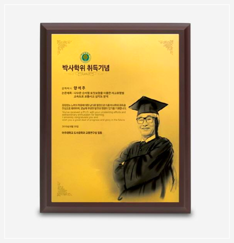 그동안 쌓으신 형설의 공으로 박사학위 취득을 진심으로 축하하오며 동문들의 축하와 감사의 뜻을 모아 이 패에 담아드립니다.