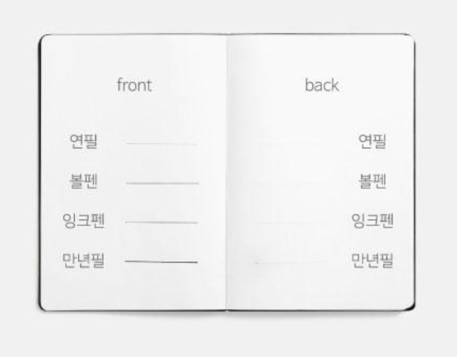 대부분의 필기구에 적합한 100g 백상지 노트입니다.만년필 사용시에도 번짐현상과 뒤비침이 없고 노트 프로 퀄리티 페이퍼는 128p로 구성되어 있습니다.