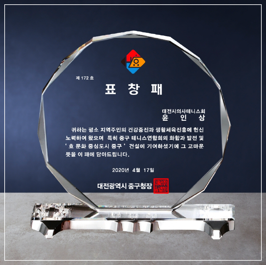 위 사람은 평소 솔선수범하는 자세로 맡은 업무에 충실하며 직장동료와의 인화 단결과 성실한 자세로 타의 모범이 되어 표창패를 드립니다.