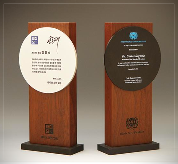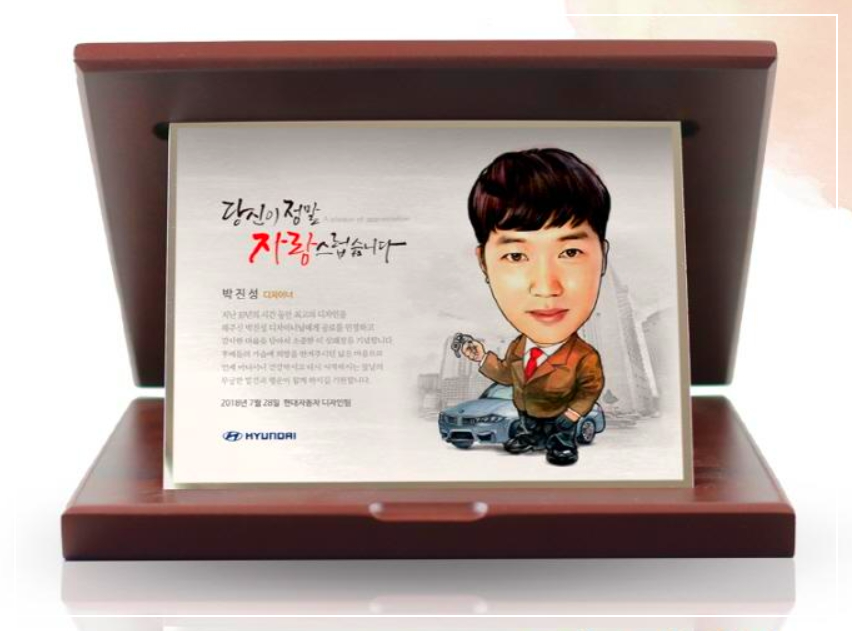 귀하께서는 회사의 일원으로서 재직하면서 탁월한 능력과 애사심으로 상호 친석과 협조증진에 앞장서 주신 정을 잊지 못하며 앞날에 무궁한 번영과 행운이 함께 하시길 빌고자 그 값진 우중의 뜻을 이패에 담아 드립니다.