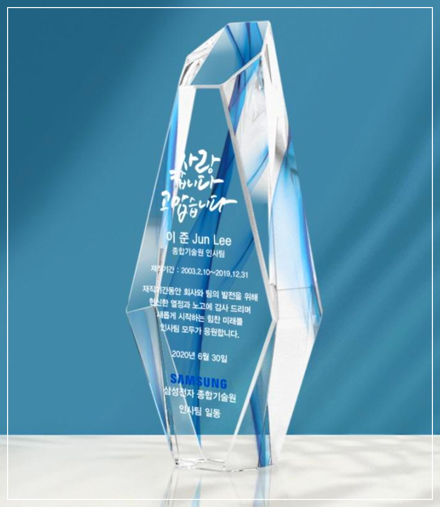귀하께서는 재직기간(재직년도) 중 맡은바 소임을 충실히 수행하였으며 특히 회사의 발전을 위해 헌신 노력하신 그 노고에 진심으로 감사드리며 전 직원과 생사고락을 같이한 그간의 정을 이 패에 담아 간직하고져 하오니 길이 귀하의 앞날에 축복이 가득하시길 기원합니다