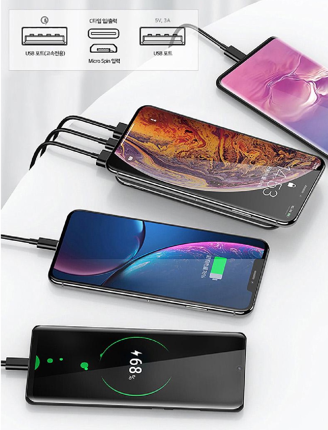 넉넉한 10000mAh 대용량 보조배터리로 장시간 사용이 가능하며 아이폰,캘럭시, 각종 태블릿, PC, C타입 규격을 지원하는 스마트 기기의 충전이 모두 호환됩니다. 기능과 성능은 높이고, 안정적인 고급 리튬 폴리머 배터리를 탑재하여 충전하는 스마트 기기의 안정성도 고려하여 제작했습니다.